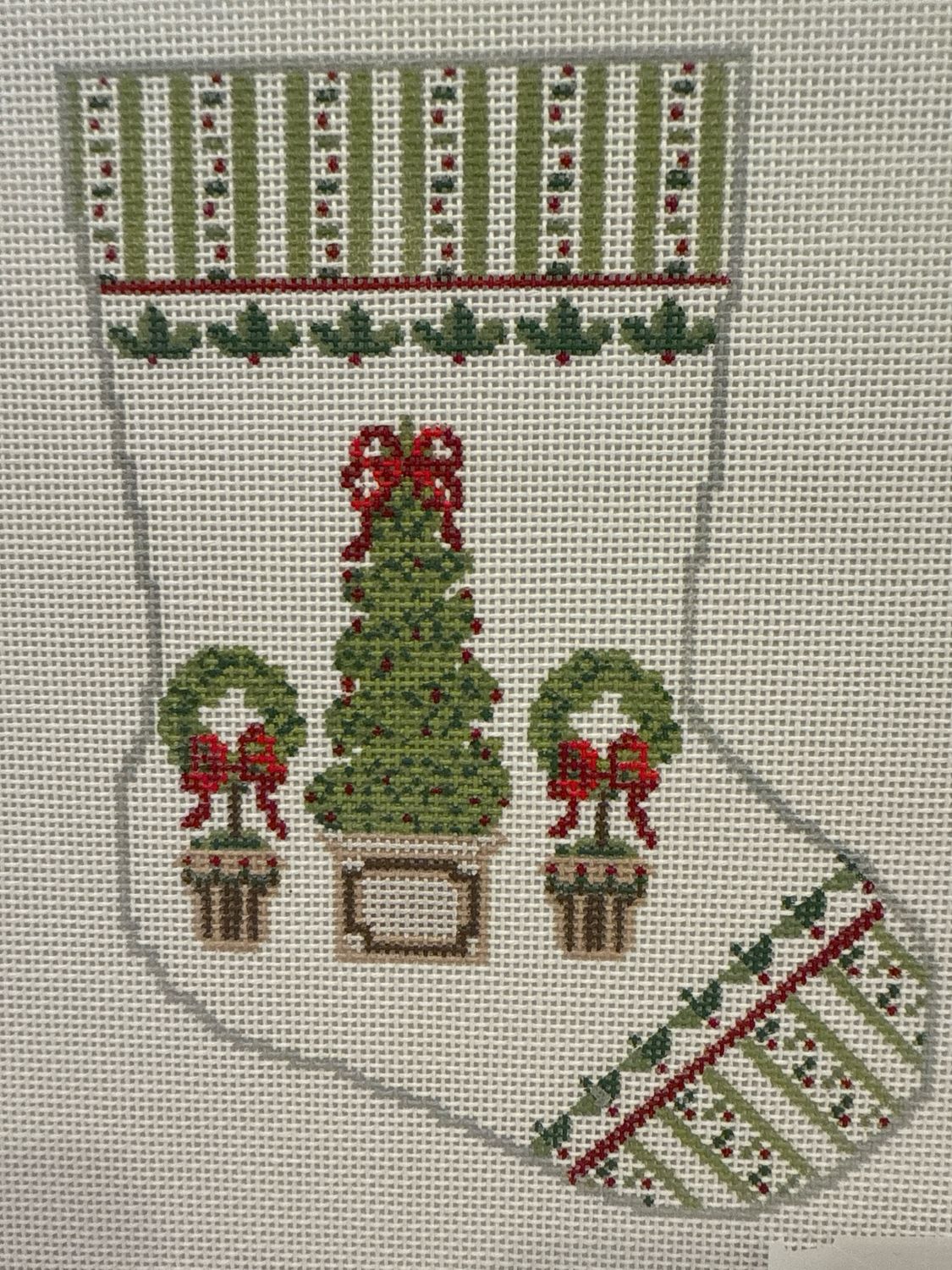 Boxwood Berry Stocking Ornament by KCN Designers on hand painted 18 mesh 10 x 9 canvas.